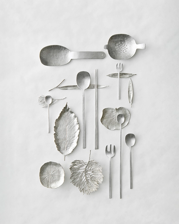 주석 (긴 댓잎 수저 받침, 어린 댓잎 차시 받침, 둥근잎맥 잔받침, 연잎 굽접시, 느티잎 잔받침/다식접시, 맥박 잔받침, 맥박 차시받침
